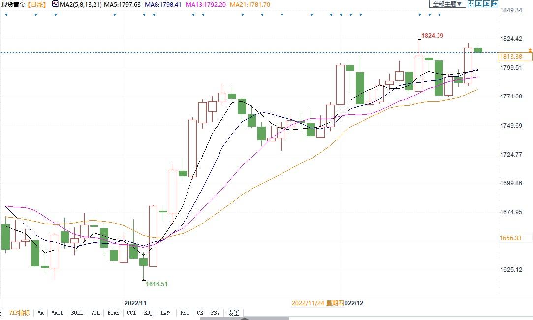 北京时间12月21日13:33,现货黄金报1813.73美元/盎司