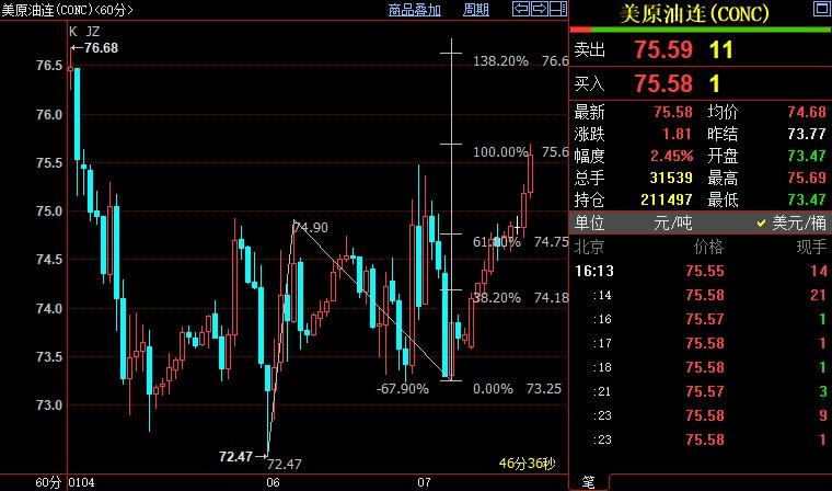 北京时间16:14,NYMEX原油期货上涨2.41%至75.55美元/桶;ICE布伦特原油期货上涨2.29%至80.37美元/桶。
