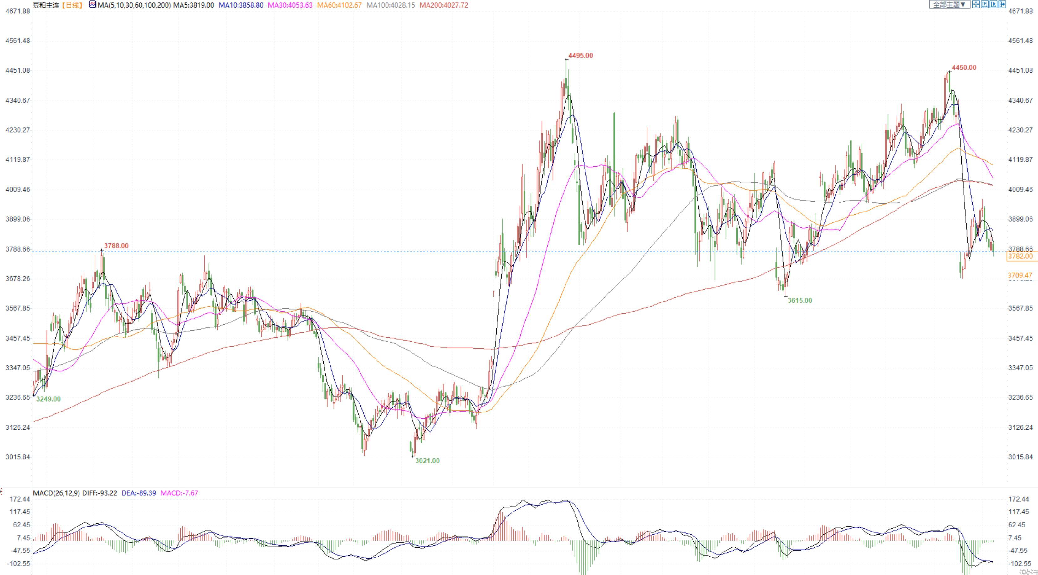 豆粕2305合约日内跌0.76%,收盘价3782元/吨,现货张家港43%蛋白豆粕4500元/吨
