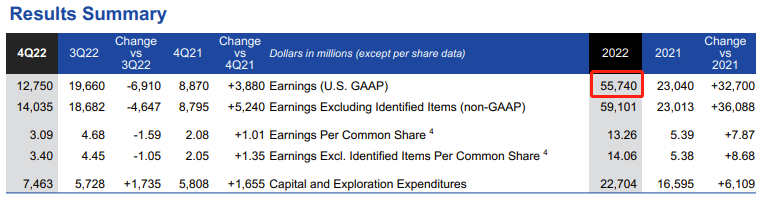 具体财报显示,埃克森美孚在2022年四季度录得127.50亿美元的利润,较2021年同期的88.70亿美元大幅增长近44%,调整后每股收益3.40美元,强于市场先前预估的3.30美元。