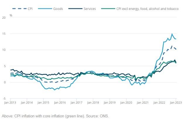 图:CPI通胀,带核心通胀(绿线) 来源:英国国家统计局