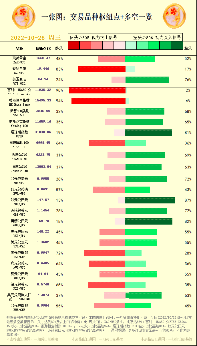 一张图:交易品种枢纽点+多空占比一览(2022/10/26周三)。截止今日(2022/10/26周三)目前最新多空数据显示,头寸达到80%及以上的品种有:★ 现货白银 XAG/USD多头占比高达83%。富时中国A50 ☆FTSE China A50多头占比高达98%。香港恒生指数 HK Hang Seng多头占比高达94%。道琼斯指数 US30空头占比高达81%。欧元兑日元 EUR/JPY空头占比高达87%。英镑兑日元 GBP/JPY空头占比高达82%。汇通网提醒,更多详见本文图表。仅供参考,不作为交易依据。